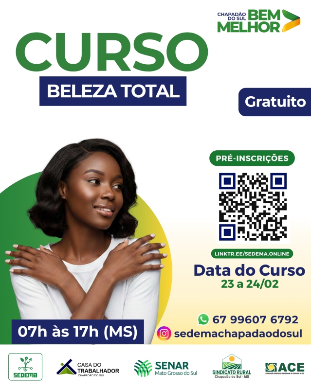 A Prefeitura de Chapadão do Sul, por meio da Secretaria de Desenvolvimento Econômico e Meio Ambiente (SEDEMA), em parceria com o SENAR/MS, Sindicato Rural e Casa do Trabalhador, está com inscrições abertas para o Curso Gratuito de Beleza Total.
